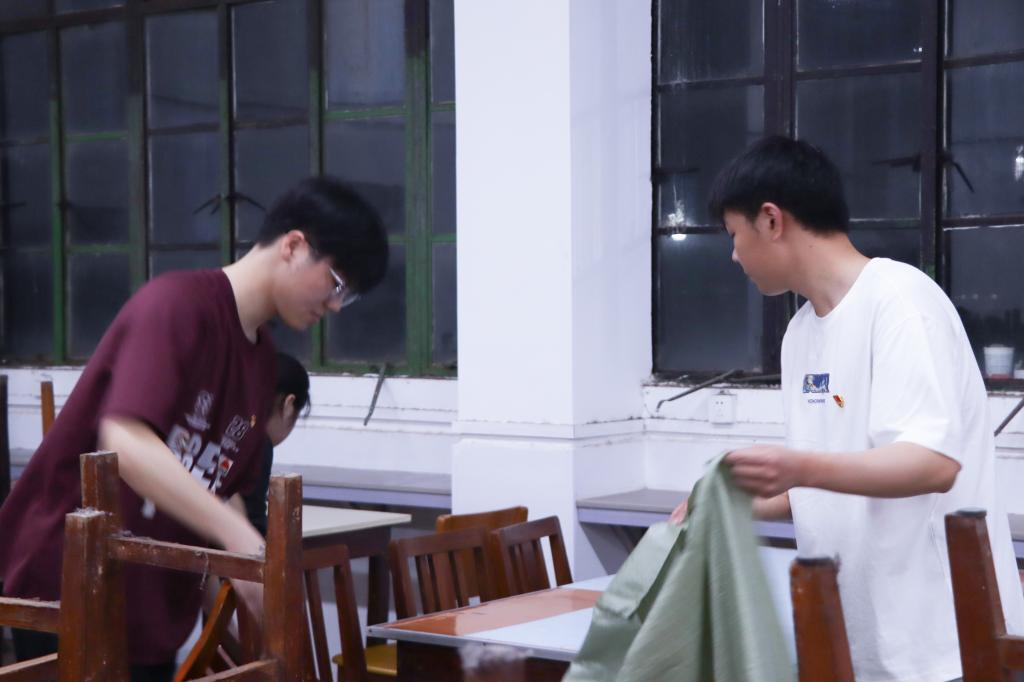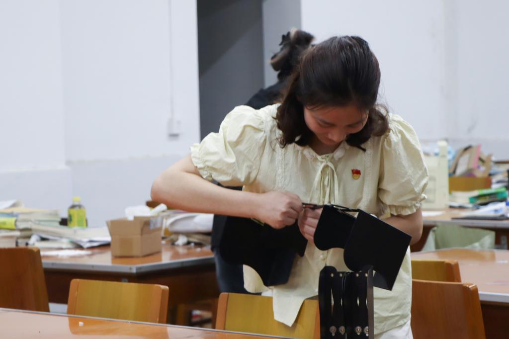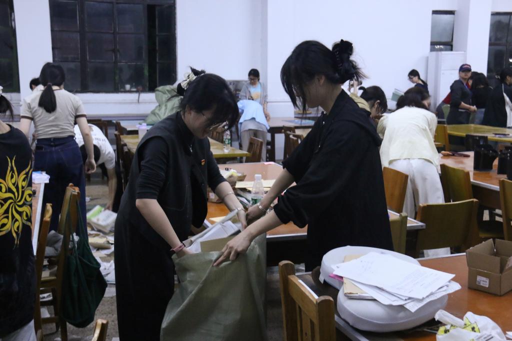 资料整理小组将同学们遗落的书籍、笔记进行分类整理,并打包好废弃的纸张,以便后续回收处理。在整理过程中,党员们深感考研学子们的不易,对他们的坚持与拼搏表示敬佩。卫生清洁小组则负责清扫地面、去除污渍和擦拭桌椅。经过他们的努力,自习室焕然一新,地面干净美观,桌椅整齐有序。