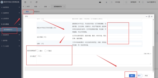 点击“评分”按钮,在弹出页面中对员工的定稿进行评分及评分意见的填写,选择是否同意答辩。最后点击“提交”或“暂存”即可,“提交”将提交到系统中去进行总评的换算,“暂存”后还可以进行修改,不会提交到系统中。