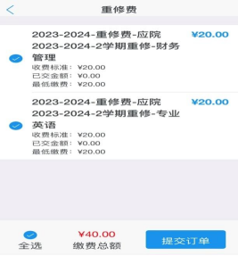 (4)勾选要进行缴费的项目,确认缴费金额,提交订单。