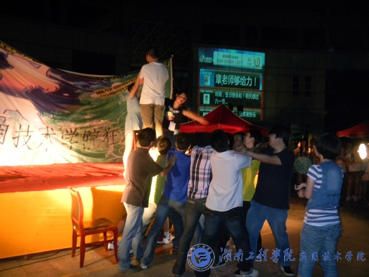 音乐,灯光,呐喊,三者齐聚,狂欢开始。KISS FLOOR舞团劲爆的街舞表演立马引爆全场,让大家High到了最高点。酷炫的街舞表演过后,主持人简单地介绍了团总支员工会各部门的职能与所起到的作用,并向在场的各位观众表示感谢。接着,“狂欢夜”进入到了游戏环节,“信任背摔”游戏由“大脚步户外拓展”俱乐部所提供,该游戏是一项培养团队间互相信任的游戏,通过游戏能让同伴间从一般了解到相互信任。游戏开始,缪老师和章老师经不住盛情相邀参与到了其中,和同学们一起游戏。活动过后,章老师笑着对记者说:“在通过沟通并产生信任的过程中,信任背摔起到了很好的载体和桥梁的作用。我相信同学们!”狂欢夜活动内容十分丰富,有创新的游戏,有现场微博抽奖项目,更有2011年校园歌手大赛亚军邓淑君同学带来的动听歌声。整场活动在同学们的热情参与下,活力四射,笑声连连。