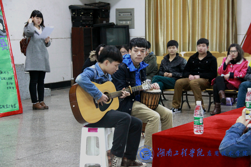 比赛在一曲《她说》中拉开了帷幕,其歌声时而轻柔,时而高亢,深情饱满,将观众带入音乐的海洋;选手倾情演唱歌曲《最美的太阳》,狂野深情,震撼心灵,现场气氛迅速升温。正在比赛进行的如火如荼之时,两位选手带来了一段由吉他和非洲鼓组合的民谣,别有一番异域情趣,赢得了观众的阵阵掌声……一首首经典曲目在选手的深情吟唱中飘荡开,落入心扉。独唱、合唱、带乐器演奏等形式各异,他们的演奏各有千秋,一如余音绕梁,久久不去。而台下的同学们也热情高涨,为台上的每一位同学加油、助威。