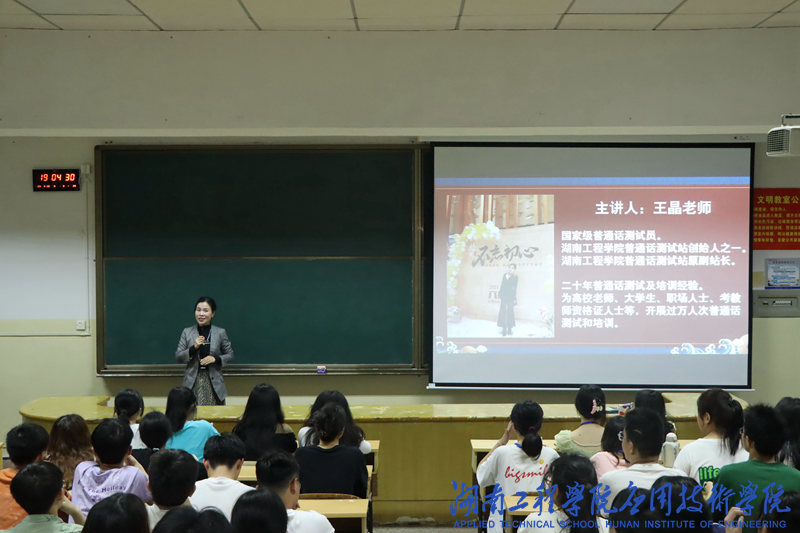 为提高员工普通话水平,更好掌握普通话表达技巧,4月20日晚,国家级普通话测试员王晶老师应邀在第一教学楼213教室举行普通话专题讲座,党委副书记陶连洲主持,全院近200名员工参加专题讲座。