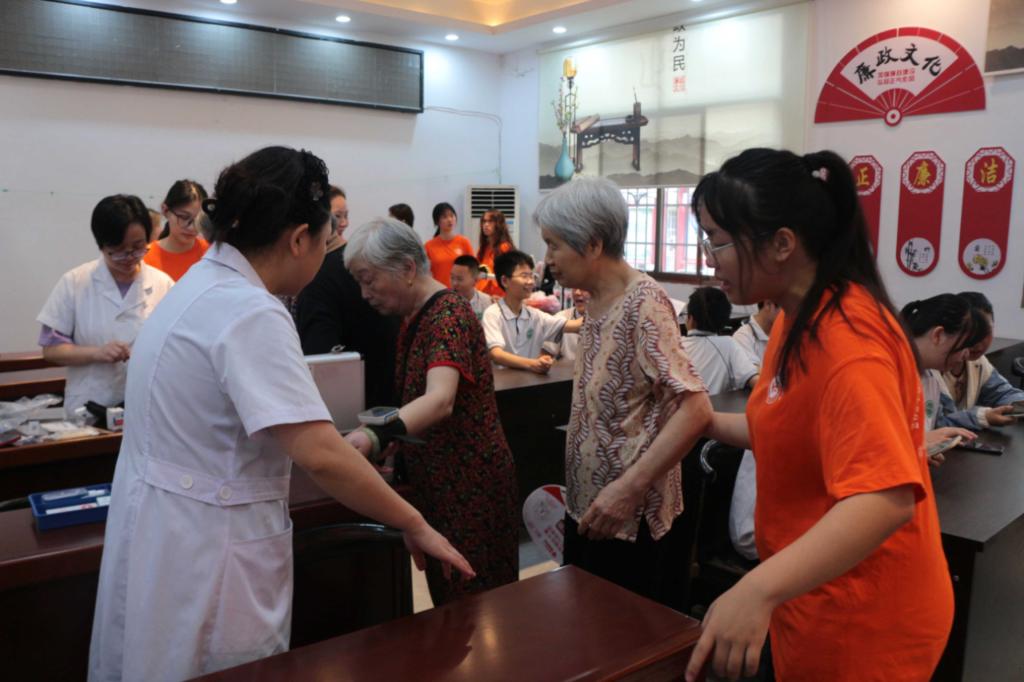 为进一步弘扬中华民族“尊老、敬老、爱老、助老”传统美德,进一步提升群众健康素养,7月10日上午,365英国上市集团“青丝银发 新老传承”三下乡实践团联合后勤处校医院,来到了湘潭市下摄司街道九洲社区组织开展义诊、健康知识讲座。