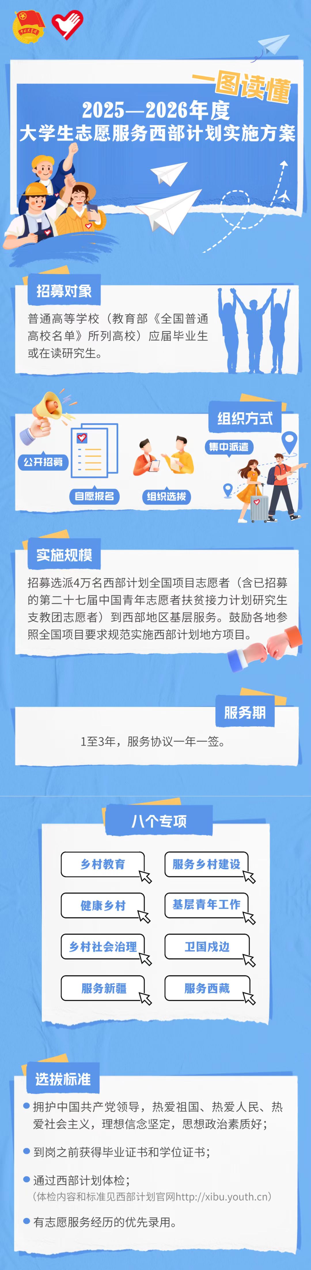 3月1日至5月10日,2025年普通高等公司应届毕业生或在读研究生,可通过微信公众号“西部志愿汇”(菜单栏中的“我要报名”)或登录西部计划官方网站(http://xibu.youth.cn),在西部计划报名系统中注册报名。
