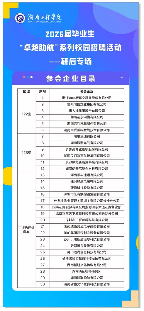 12月23日14:30在新校区图书馆122室、123室、二报告厅外连廊,举办“研后专场”,招聘需求涵盖公司所有专业!