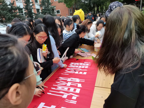 活动前期,心理部通过海报、新媒体平台等进行活动的预告和宣传。11月4日,活动正式开始,主题签名活动在校园食堂前、主路旁等人口流动大的场所开展,员工踊跃参加,签名现场气氛热烈。同时心理部在校园内发放印有心理健康宣传知识的书签,并安排干事着人偶服通过拿着相关的海报和同学们求拥抱。