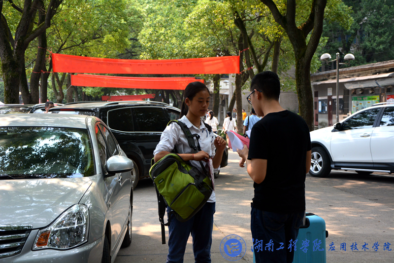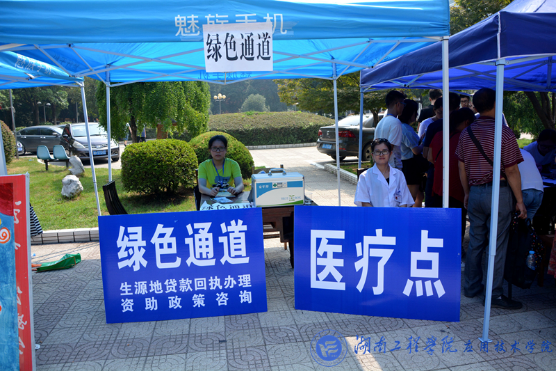 电气大楼前坪设有各班注册点,以及家长员工休息处、行李存放处、治安咨询处和绿色通道站等服务小站。在“绿色通道”服务处,辅导员蒋惠筠为家庭贫困新生及其家长详细地介绍了如何进行生源地贷款,以及公司的奖学金、助学金资助等方面的内容。