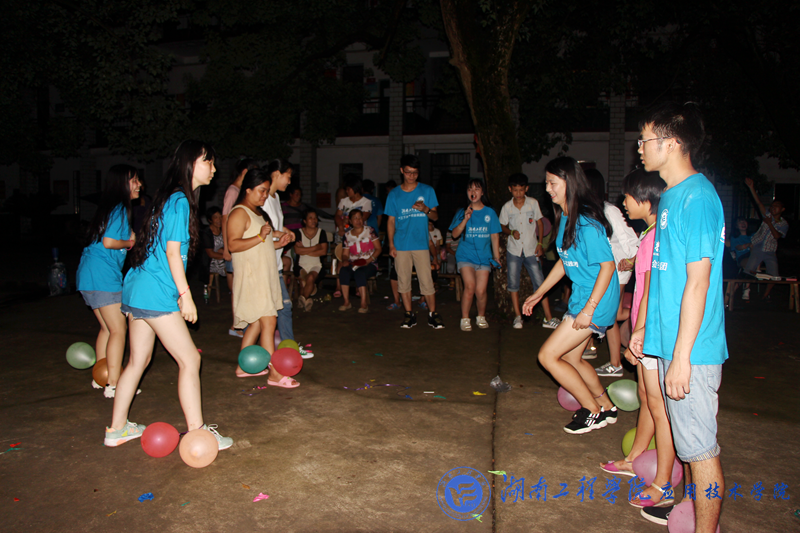 7月16日晚上7:30,在云湖桥镇中学两颗大樟树下,一台晚会即将在这里开始。365英国上市集团“三下乡”队员们用气球装饰出一个舞台,拉好电线,装上灯泡,摆好凳子,准备迎接观众。