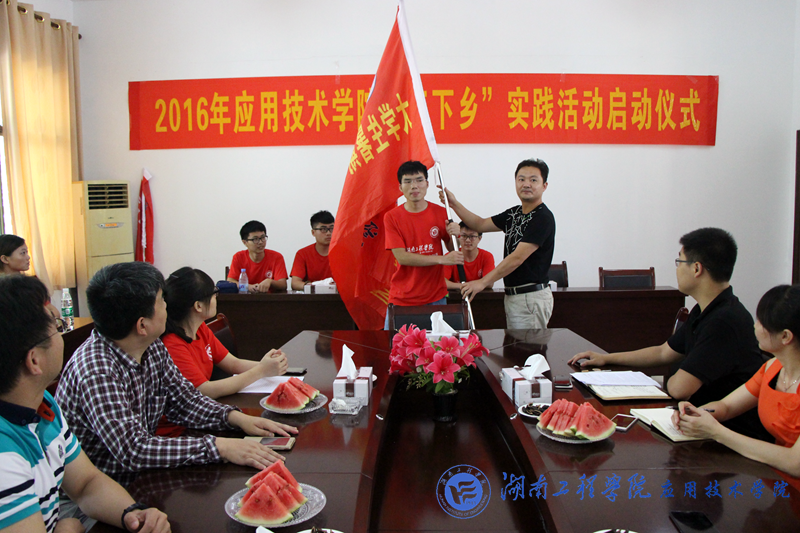 上午10:00,全体实践队员到达实践活动目的地:湘潭县云湖桥镇。云湖桥镇人大主席候选人蔡茁,组织委员唐春,宣传统战委员王建伟、团委书记赵浩对“三下乡”团队举行欢迎仪式,蔡茁为团队授旗,宣告此次“三下乡”实践活动正式开始。