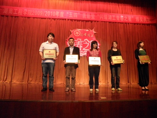 该典礼特别表彰了闪耀湖工青春之星,其中包括“学习之星”、“自强之星”、“科技之星”、“创业之星”、“魅力之星”、“体育之星”、“才艺之星”、“诚信之星”、“志愿之星”和“见义勇为之星”。公司机设0884班周里霄霄荣获“才艺之星”。周里霄霄同学领奖后,以一首《秀我自己》的RAP表演展示了自己不凡的才艺。2009级新生才艺大赛冠军、公司焦子弦同学表演小提琴独奏《金色的炉台》,将典礼推向高潮。