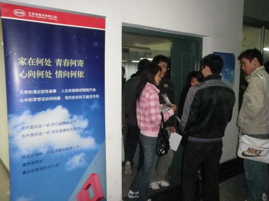 为帮助解决2010届毕业生就业难题,使其与用人单位“面对面”沟通,真正落实“供需见面、双向选择、自主择业”的就业政策,4月15日晚7:00,比亚迪公司在主校区举办了现场招聘会。