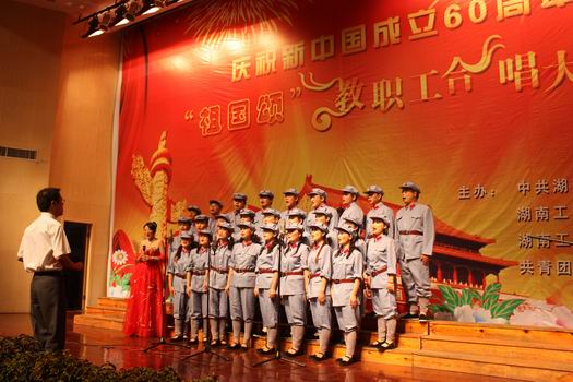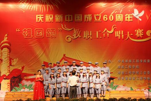 为庆祝中华人民共和国成立六十周年,弘扬和振奋民族精神,激发教职工爱国热情,铭记革命历史,9月29日7:30,在图书馆一报告厅公司举行了以“祖国颂”为主题的教职工合唱大赛。大赛由公司党委、公司行政、校工会和校团委联合主办。省教育厅党组成员、省教育工会主席李宪华,省教育工会副主席王常华,省教育工会女工委主任杨兰英及公司党委书记谢伯端、董事长刘国荣等领导出席了此次盛会。