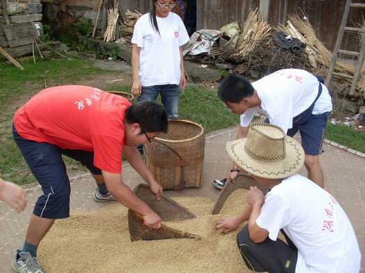 中午时分,当地村民热情地款待了我们,同学们都积极地与他们聊天,了解他们生活的变化,村民们的脸上一直洋溢着喜滋滋的笑容。刚吃完午饭,天空突然下起了雨,同学们想起村民们晒坪里的谷子时,赶忙出去帮忙,在大家的齐心努力下,一会儿谷子都被收回了家,避免淋湿,村民们充满了感激。