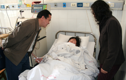 3月24上午9点,阳光和煦,在长沙市湘雅附三医院心血管病房,我们再次看到了魏秧子同学, 这一次是公司经理书记等一行特地驱车从公司赶到医院来看望正在进行血液采集的她。