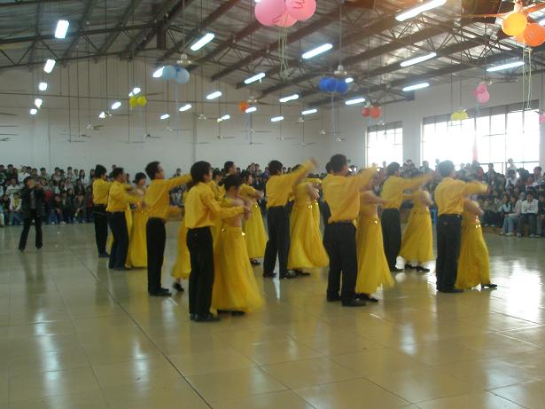 随后进行的集体舞则是一道视觉大餐,各代表队的队员身着华丽的服装,一一亮相。尤其是公司代表队一出场就吸引了全场观众的眼球。从自信的笑容、统一的服装和精致的舞蹈编排上可以看出他们在赛前下了一番功夫,付出了不少心血。全体队员身着亮黄色的舞衣,女生裙裾飘飘,男生风度翩翩,他们优美的舞姿仿佛把观众们带到了华丽的晚宴现场,让人叹为观止。