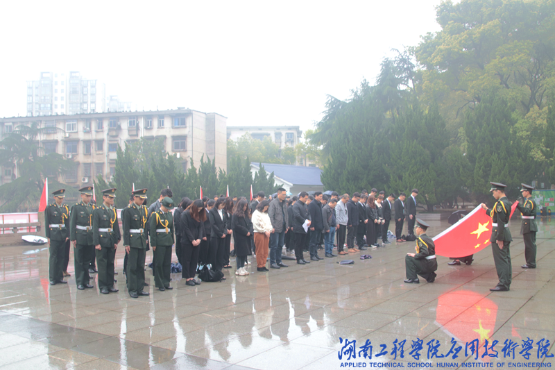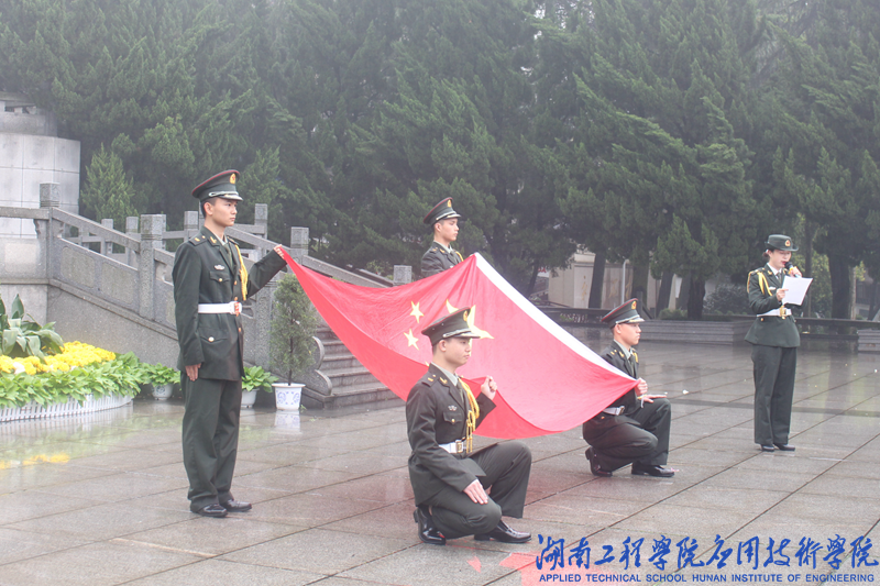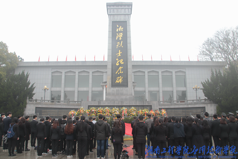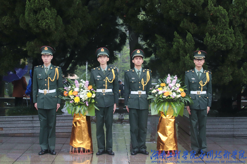 上午7:30,大雨滂沱,全体人员怀着敬仰的心情,迈着沉重的脚步走进烈士陵园。陵园烈士纪念碑前,全体肃立,奏唱国歌,国旗护卫队队员向革命烈士敬献花篮,全体师生默哀致敬。退伍军人代表刘倪萍同学发言,历史不能忘却,要牢记为中国人民和中华民族作出贡献的前辈们,继承先烈遗志,努力奋斗,报效祖国。经理李光中发表讲话指出,无数英雄烈为了社会主义革命和建设事业士抛头颅,洒热血,赴汤蹈火,舍生忘死,换来了国人今天幸福美好的生活,他们是永远不能忘却的纪念。李光中勉励同学们以英烈为榜样,珍惜学习机会,锐意进取,砥砺前行,为祖国的繁荣富强、为实现中华民族伟大复兴的中国梦而努力奋斗。最后,全体人员向烈士纪念碑行三鞠躬礼,绕纪念碑一周。