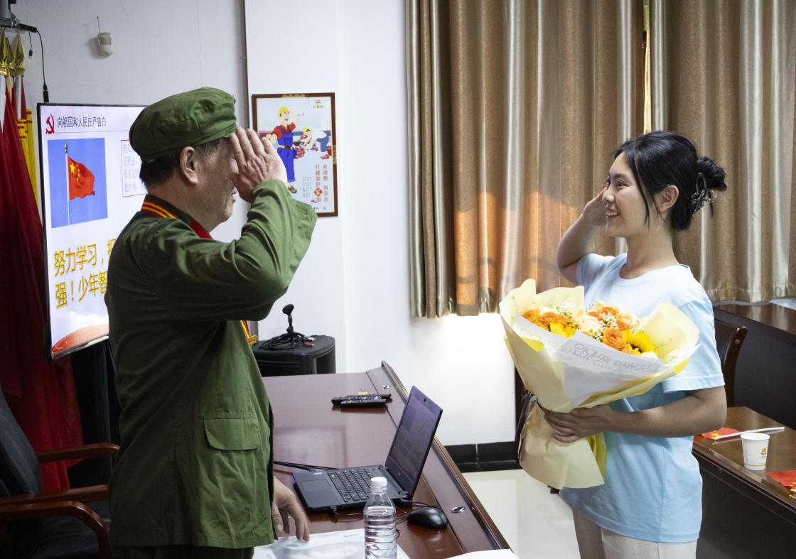 正值酷暑,罗艾群依旧身着65式军服,头戴军帽,胸佩奖章,以军人之姿挺立于讲台前。党课中,罗艾群作为对越反击战的亲历者,将参战岁月的红色记忆娓娓道来:炮弹来了,即便用身体阻挡,也绝不能让战友受到第二次伤害是他时刻践行的准则。战友唐远方不幸牺牲后,罗艾群将他的父母视为亲生父母照料,直至二老离世。这份跨越数年的坚守,是他兑现当年入伍时的铮铮誓言,更是革命军人的深厚情谊。一寸山河一寸血,罗艾群身体力行地为祖国奉献青春,他号召在座同学们:“ 作为华夏儿女,铭记英烈,敬仰英雄,努力学习,报效祖国!”