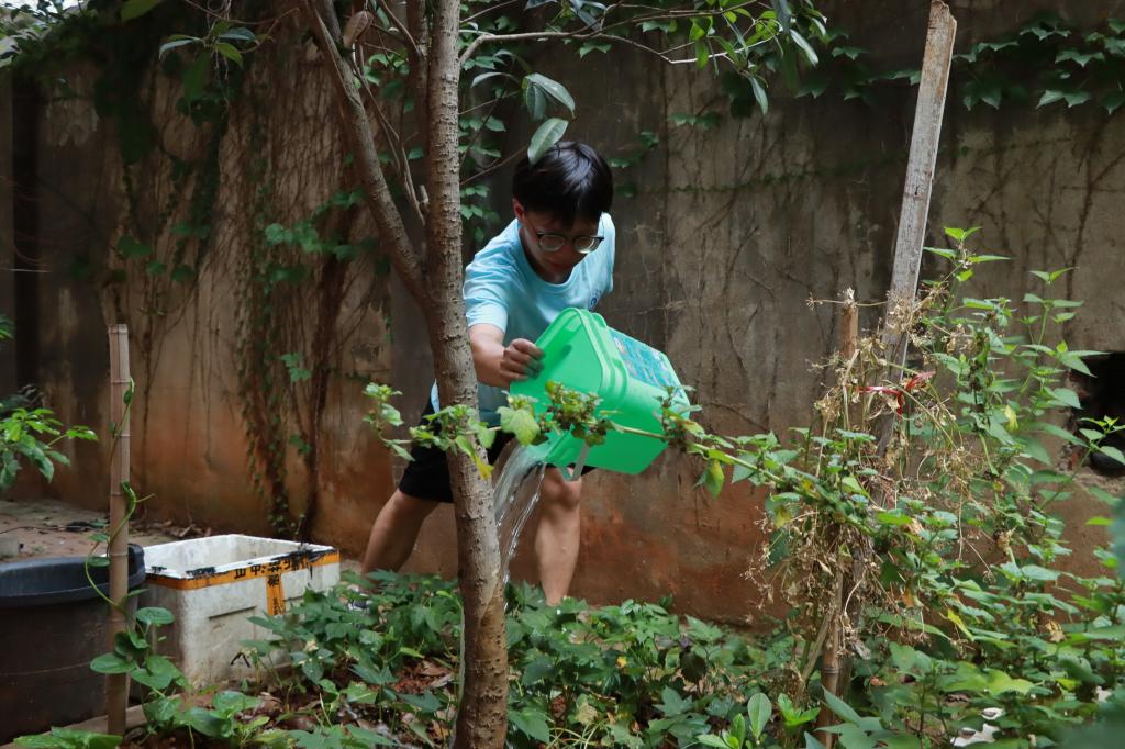 另一组志愿者拿着水桶、水管,穿梭于社区的主干道和公园,配合小区工作人员浇灌树苗及绿化带。男同志们主动承担起提水、运水等体力工作,其他志愿者则有序进传递和行浇灌作业,形成了一条高效的“供水流水线”。